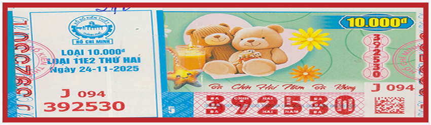 KẾT QUẢ XỔ SỐThứ Hai, ngày 24-11-2025Loại vé: 6 số, 10.000đ, Kí hiệu: 11E2 | |