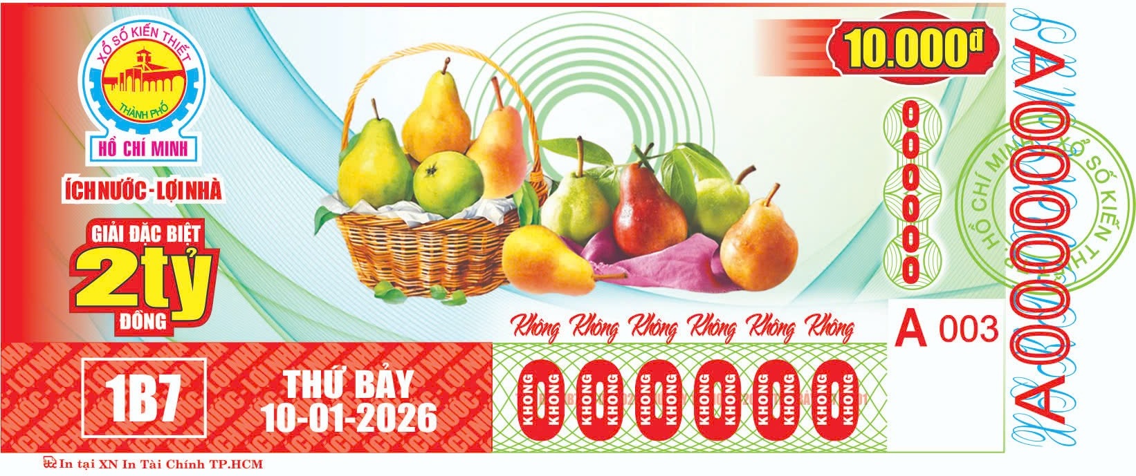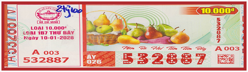 KẾT QUẢ XỔ SỐThứ Bảy, ngày 10-01-2026Loại vé: 6 số, 10.000đ, Kí hiệu: 1B7 | |