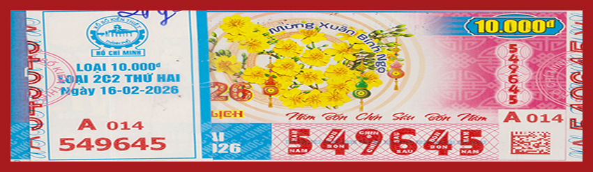 KẾT QUẢ XỔ SỐThứ Hai, ngày 16-02-2026Loại vé: 6 số, 10.000đ, Kí hiệu: 2C2 | |