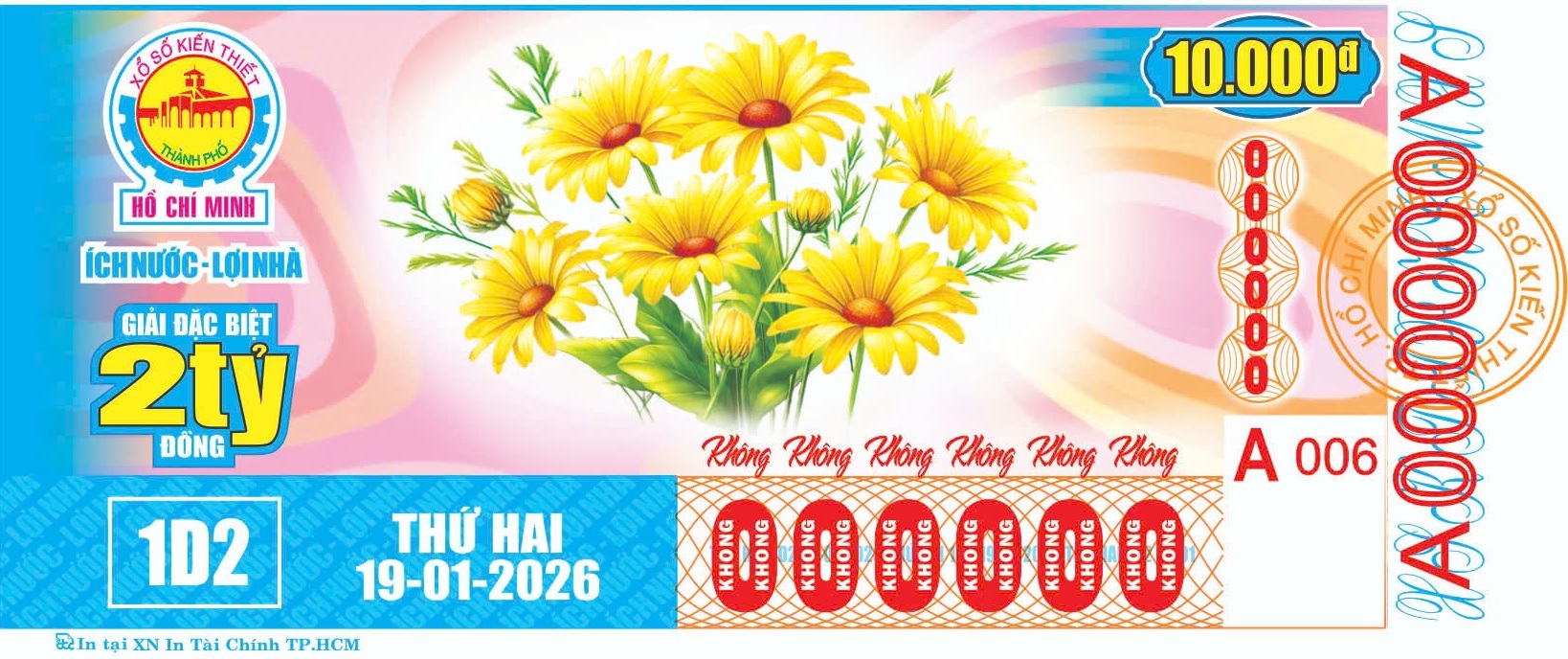 KẾT QUẢ XỔ SỐThứ Hai, ngày 19-01-2026Loại vé: 6 số, 10.000đ, Kí hiệu: 1D2 | |