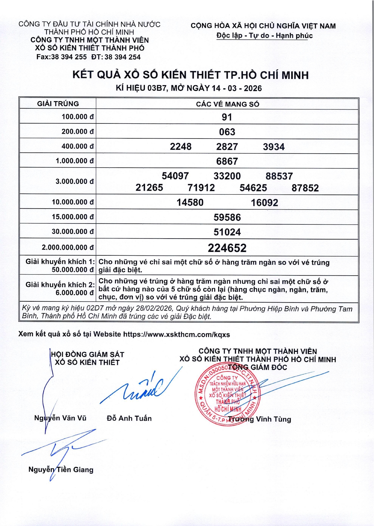 Kết Quả Quay Số Mở Thưởng Ngày 14/03/2026 admin Hình ảnh Đính kèm 2026_03_14_1_.pdf pdf 594.19 KB 14/03/2026 admin Tải xuống Xem trước Zing Linkhay Twitter Google Facebook Yahoo Save Print Bài đăng khác CÔNG TY TNHH MTV XỔ SỐ KIẾN THIẾT TP.HCM CHUNG TAY HỖ TRỢ SỬA CHỮA “NHÀ ĐẠI ĐOÀN KẾT” TẠI PHƯỜNG AN NHƠN Công ty TNHH Một thành viên Xổ số Kiến thiết Thành phố Hồ Chí Minh đã tổ chức Sinh hoạt chuyên đề, trải nghiệm tàu Metro, khen thưởng danh hiệu “Tập thể và Cá nhân Công đoàn xuất sắc năm 2025” Kết Quả Quay Số Mở Thưởng Ngày 9/03/2026