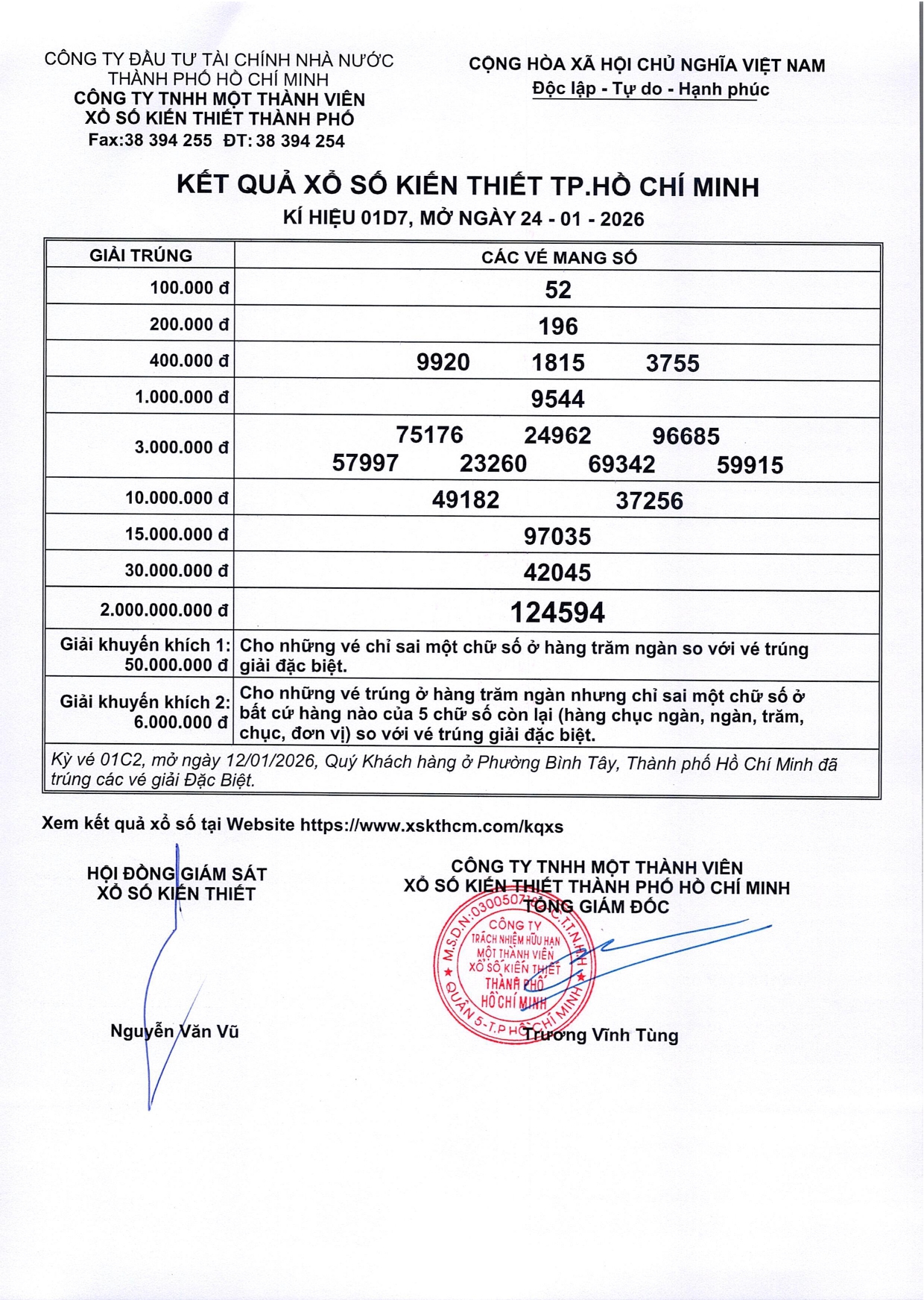 Kết Quả Quay Số Mở Thưởng Ngày 24/01/2026 admin Hình ảnh Đính kèm 2026_01_24_1_.pdf pdf 876.29 KB 24/01/2026 admin Tải xuống Xem trước Zing Linkhay Twitter Google Facebook Yahoo Save Print Bài đăng khác Kết Quả Quay Số Mở Thưởng Ngày 19/01/2026 HỘI NGHỊ TỔNG KẾT HOẠT ĐỘNG SẢN XUẤT KINH DOANH 05 NĂM 2021 -2025 VÀ NĂM 2025 CỦA CÔNG TY TNHH MTV XỔ SỐ KIẾN THIẾT TP.HỒ CHÍ MINH. Kết Quả Quay Số Mở Thưởng Ngày 17/01/2026