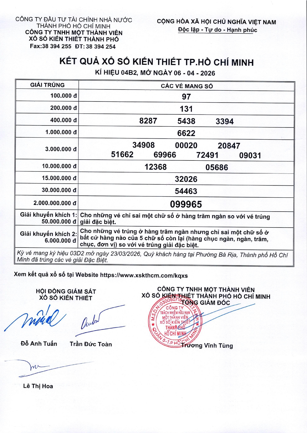Kết Quả Quay Số Mở Thưởng Ngày 6/4/2026 admin Hình ảnh Đính kèm 2026_04_06_1_.pdf pdf 591.64 KB 06/04/2026 admin Tải xuống Xem trước Zing Linkhay Twitter Google Facebook Yahoo Save Print Bài đăng khác Nhiều hoạt động thiết thực chào mừng 95 năm ngày thành lập Đoàn Thanh niên Cộng sản Hồ Chí Minh (26/3/1931 – 26/3/2026) Kết Quả Quay Số Mở Thưởng Ngày 4/4/2026 Kết Quả Quay Số Mở Thưởng Ngày 30/03/2026 Kết Quả Quay Số Mở Thưởng Ngày 28/03/2026