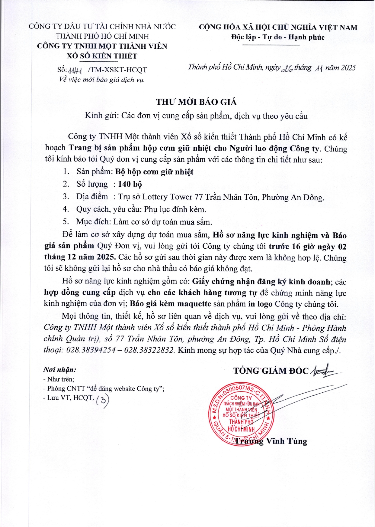 Thư mời báo giá bộ hộp cơm giữ nhiệt admin Zing Linkhay Twitter Google Facebook Yahoo Save Print Bài đăng khác Thư mời báo giá gói dịch vụ trang trí Noel - Tết Dương lịch Thư mời báo giá gói cung cấp áo thun quảng cáo Thư mời báo giá gói cung cấp sổ dò vé số
