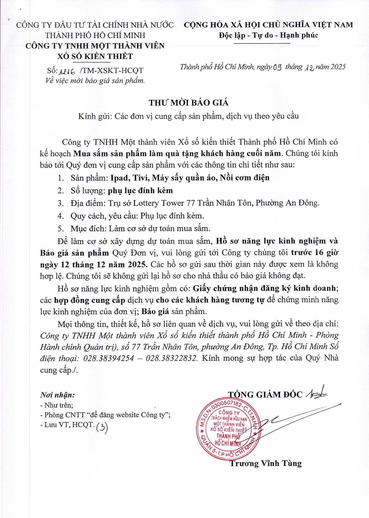 Thư mời báo giá Ipad, Tivi, Máy sấy quần áo, Nồi cơm điện admin Zing Linkhay Twitter Google Facebook Yahoo Save Print Bài đăng khác Cán bộ, người lao động Công ty Xổ số kiến thiết Thành phố Hồ Chí Minh chung tay ủng hộ đồng bào miền Trung bị thiệt hại do bão lũ gây ra Thư mời báo giá bộ hộp cơm giữ nhiệt Thư mời báo giá gói dịch vụ trang trí Noel - Tết Dương lịch